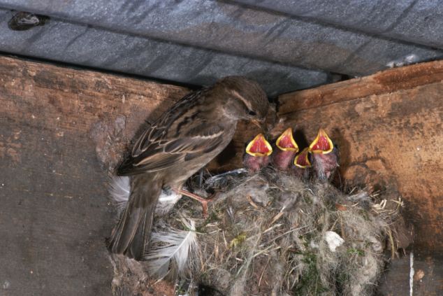 ca. 1960-1995 — An adult house sparrow with its begging young chicks at its nest in the eaves of a building. — Image by © Brian S. Turner/Frank Lane Picture Agency/Corbis
